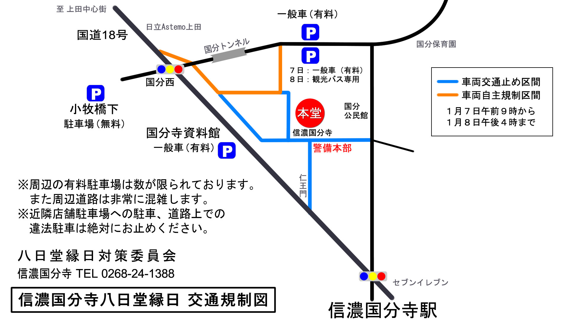 毎年、上田市国分の信濃国分寺では1月7日から8日にかけて八日堂縁日が開催されます。本堂では護摩法要やご祈祷が行われ、厄除けのお守り「蘇民将来符」や縁起物のだるまを求める人でにぎわいます。信濃国分寺の周辺は大変混雑し大渋滞が予想されます。八日堂縁日へはしなの鉄道「信濃国分寺駅」のご利用をお薦めします。駅から信濃国分寺までは徒歩で約5分です。この縁日で頒布される蘇民将来の護符は2種類あり、お寺で用意するものと蘇民講と呼ばれる人達が作るもの(絵蘇民)があります。絵蘇民は七福神の絵入りの蘇民将来で1月8日午前8時より頒布されます。 朝早くから絵蘇民や蘇民将来符、福だるまを求める人で境内が賑わいます。